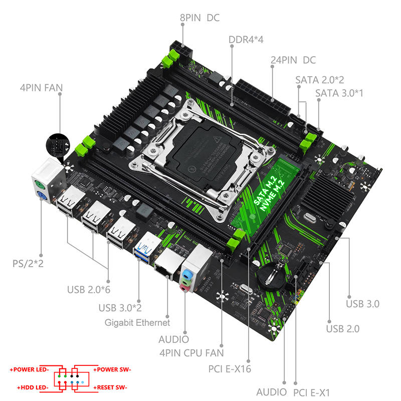 Storage ports: PCIE 3.0 X4 M.2(Support NVME M.2 and SATA M.2 mode interchange, initial state is NVME M.2), SATA 2.0 x3