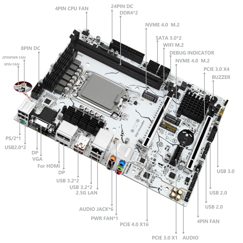 Fan power supply ports: 3PIN System FAN x1, 4PIN System FAN x1, 4PIN CPU FAN x1, 2PIN PWR FAN x2(Monitor the fan operation status and control the speed of the fan)