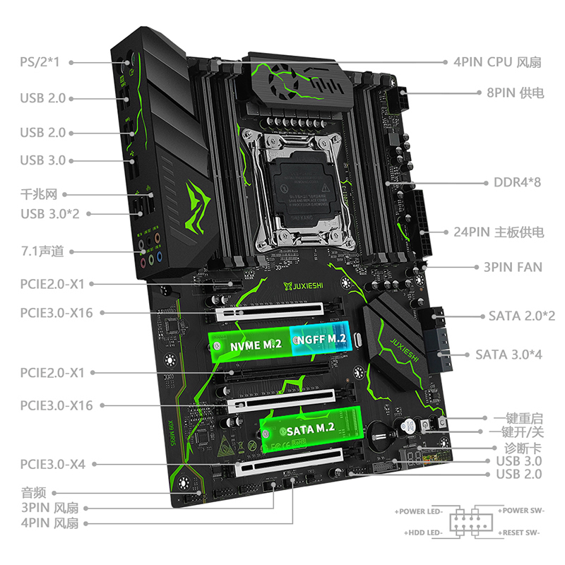 功能性接口:诊断卡*1 蜂鸣器*1 一键开关机*1 一键重启*1