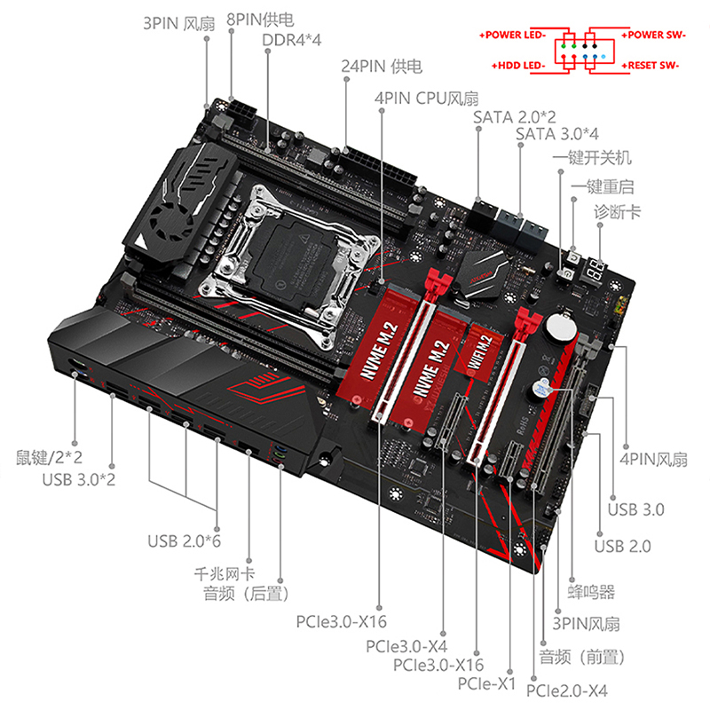 其他功能性接口:诊断卡*1 一键开/关机*1 一键重启*1 蜂鸣器*1